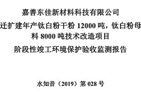 公?? 示??? 根據(jù)《國務(wù)院關(guān)于修改〈建設(shè)項目竣工環(huán)境保護(hù)管理條例〉的決定》(國務(wù)院令第682號),以及環(huán)保部《關(guān)于發(fā)布的公告》(國環(huán)規(guī)環(huán)評[2017]4號),現(xiàn)將嘉善東佳新材料科技有限公司遷擴(kuò)建年產(chǎn)鈦白粉干粉12000噸,鈦白粉母料8000噸技術(shù)改造項目階段性竣工環(huán)境保護(hù)